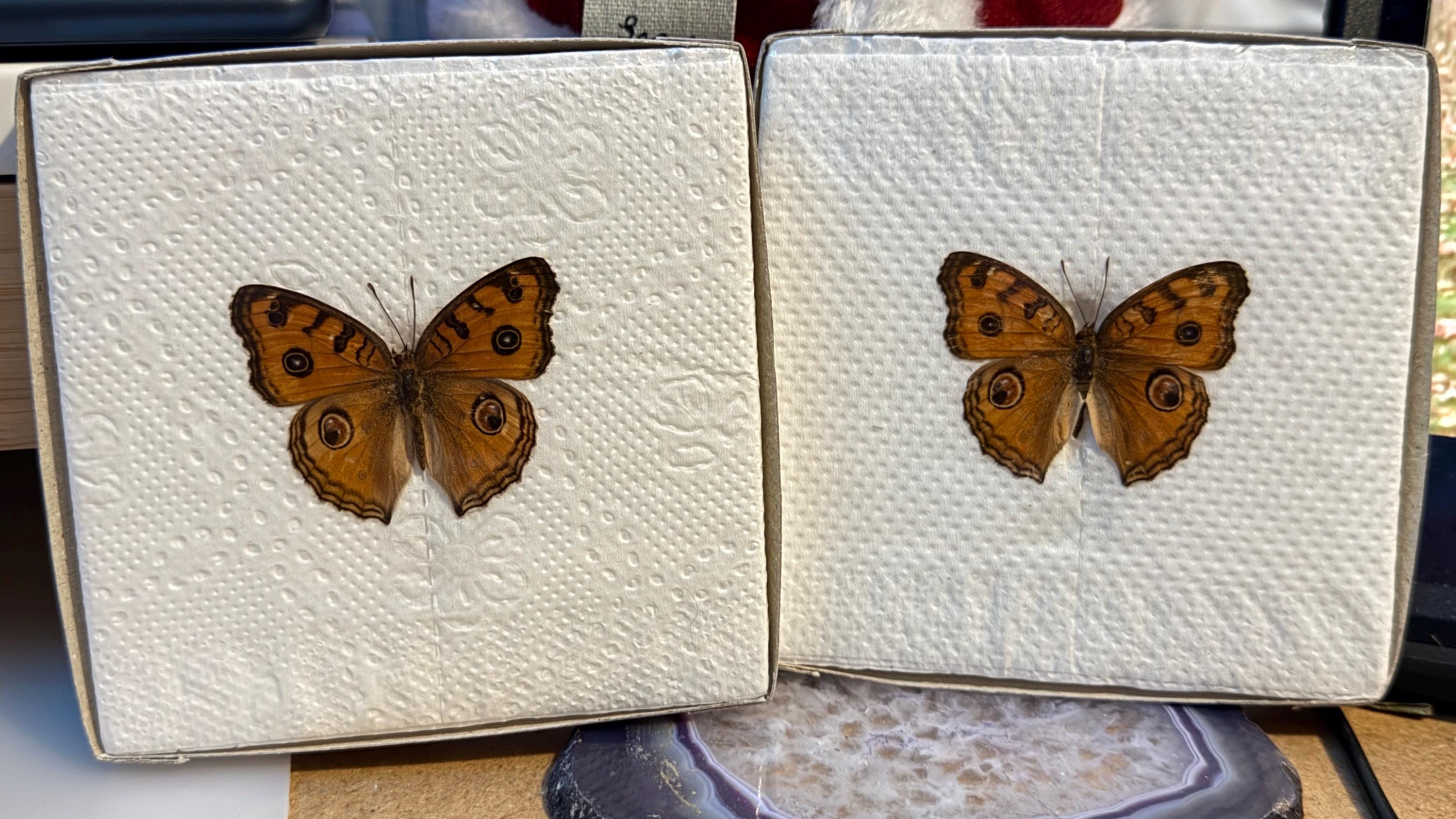 Dried unmounted butterflies, this term means the wings are closed and the butterfly is dehydrated. In order to open the wings, one must 'set' the butterfly. In order to set a butterfly, it must first be rehydrated. Place the butterfly inside an airtight tupperware box lined with moist kitchen paper. After a few days, the butterfly becomes rehydrated and it is only then the specimen's wings and antenna can be manipulated. Butterfly and insect setting is an art form and will undoubtedly take several attempts over time to achieve the desired form.
