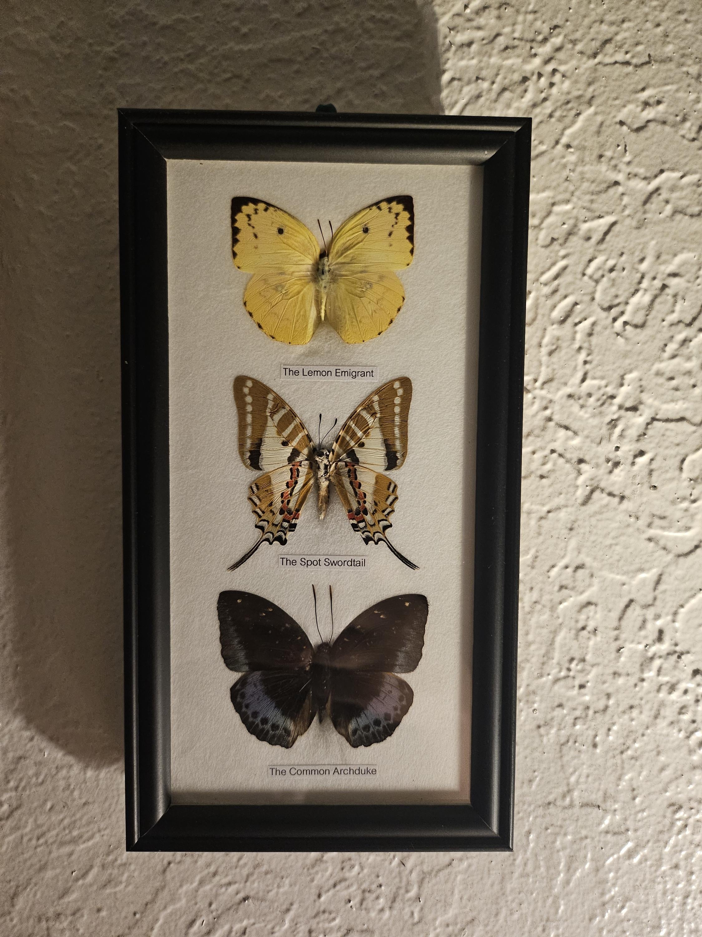 Every butterfly frame is unique, this means the frame you receive will differ from the photo, so please only use the photos as a guide. The actual butterflies vary from season to season.